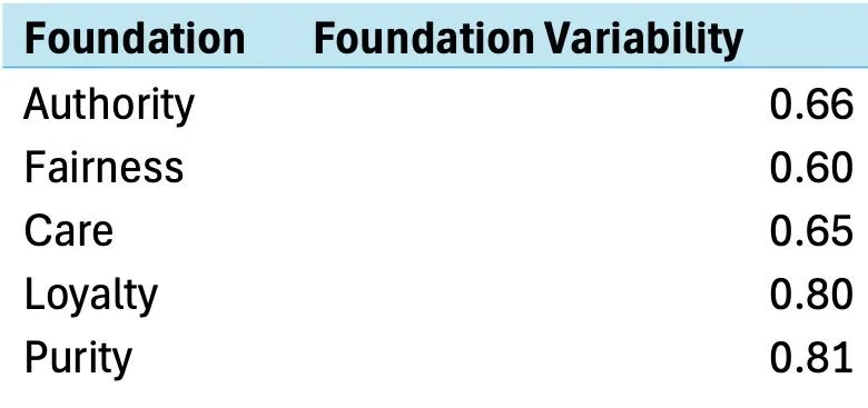 We also found that different moral foundations are more variable than others. For example, Fairness is quite stable while Purity shows more variability: